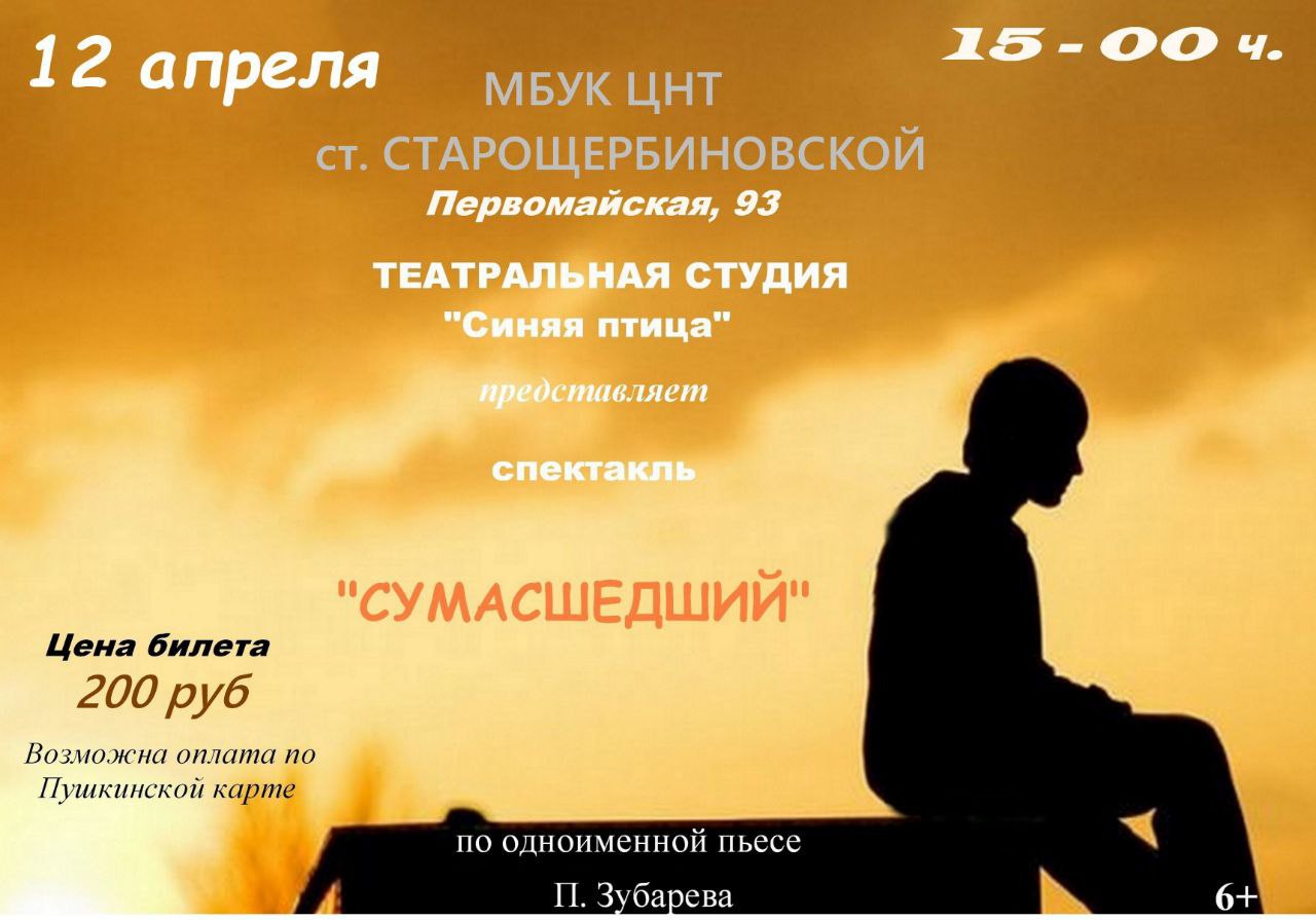 12 апреля в 15.00 театральная студия «Синяя птица» Центра народного творчества представляет спектакль по одноименной пьесе П. Зубарева «Сумасшедший» . Актеры - студенты и учащиеся ст. Старощербиновской. Цена билета 200 рублей, оплата доступна по Пушкинской карте. Ссылка на покупку билетов: https://btickets.ru/widget/6317/scheme