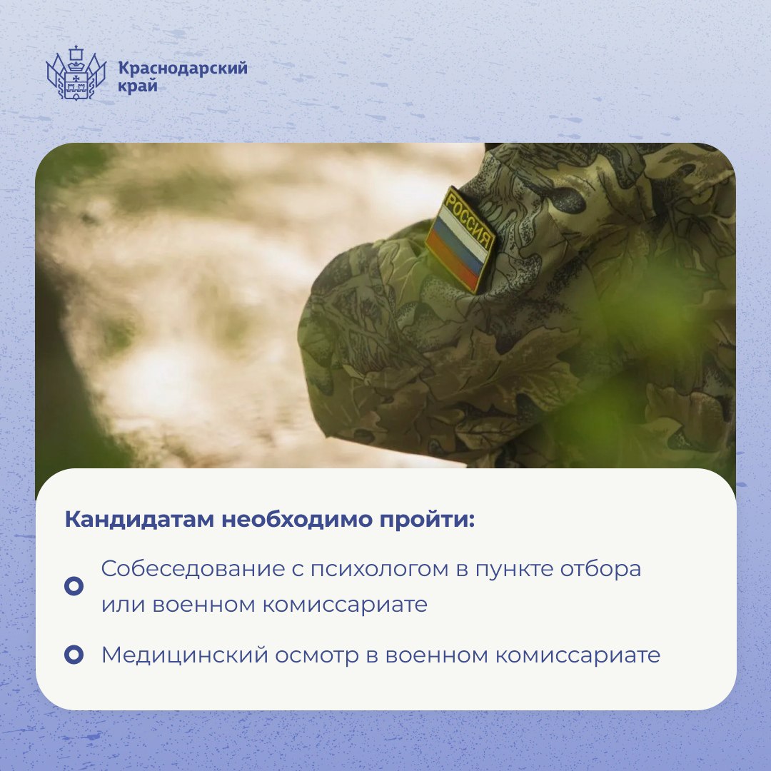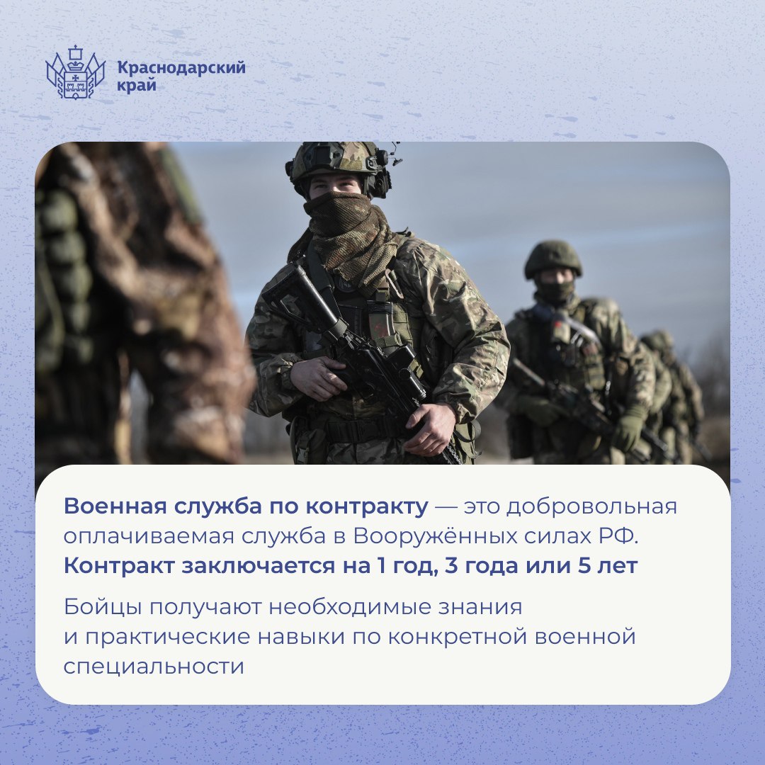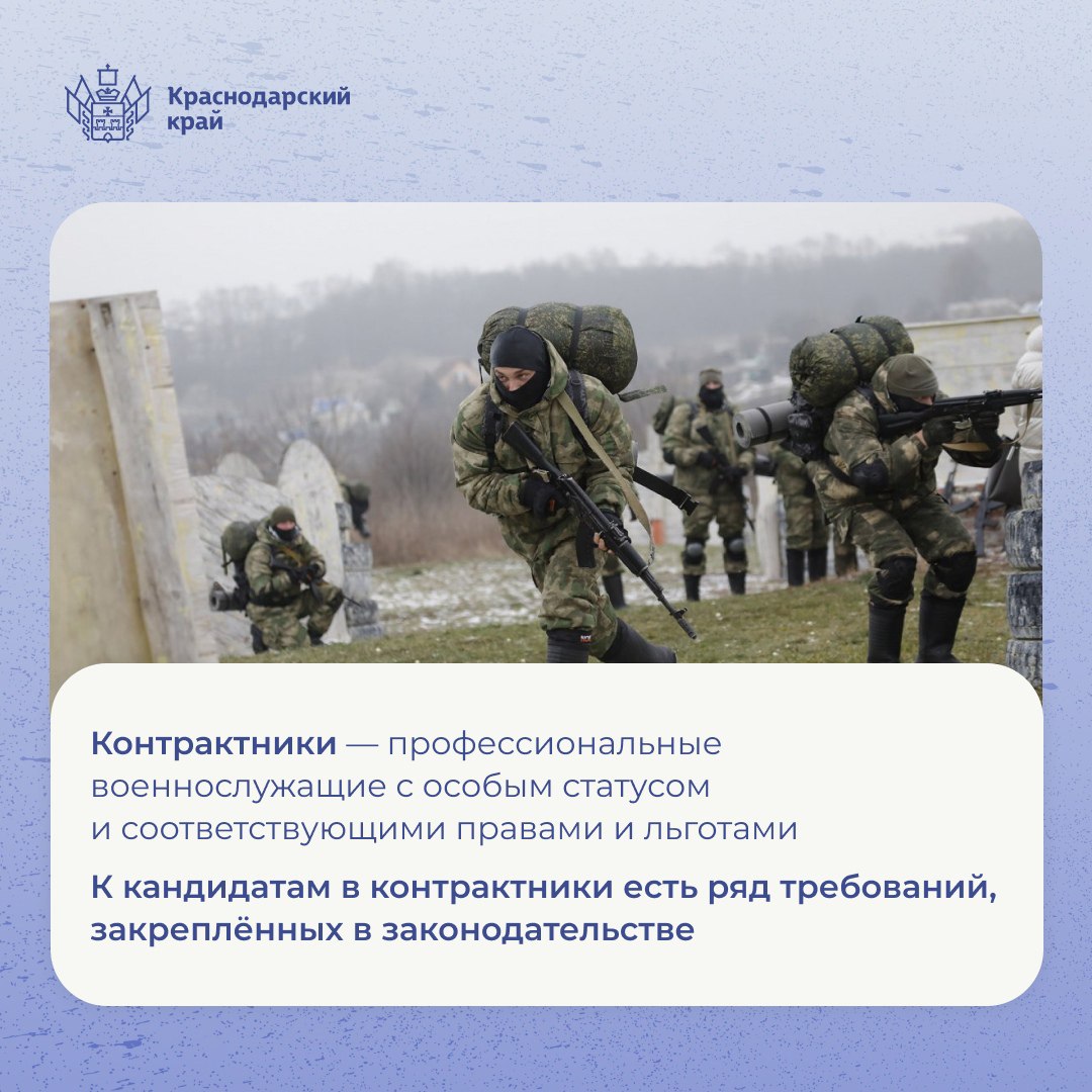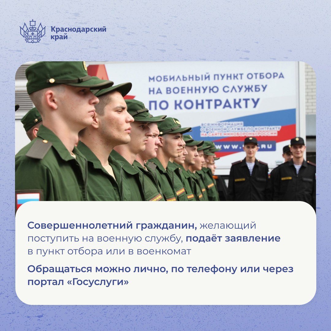 На Кубани проходит набор на контрактную службу в ВС РФ. Присоединяйтесь к защитникам страны здесь https://contract.gosuslugi.ru/ По всем вопросам обращайтесь в военные комиссариаты и в краевой пункт отбора: 8 (861) 258-35-40