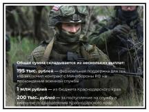 Контрактники получат выплату за службу в именных подразделениях Краснодарского края. Вы тоже можете встать на защиту страны. За информацией обращайтесь в военные комиссариаты и в краевой сборный пункт 8-861-262-20-36 или по номеру 117.