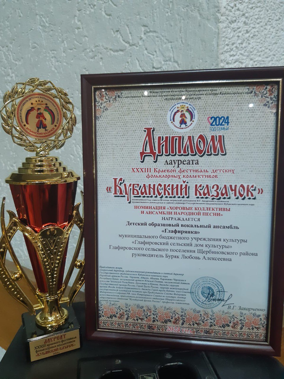 Детский образцовый вокальный ансамбль «Глафирянка» – Лауреат краевого фестиваля фольклорных коллективов «Кубанский казачок». Вчера в Краснодаре состоялся гала-концерт краевого фестиваля. На концерте выступили 23 лучших творческих коллектива, ставшие победителями и призерами зонального этапа конкурса. Детский образцовый вокальный ансамбль «Глафирянка» Глафиировского сельского Дома культуры, руководитель Любовь Буряк удостоен диплома Лауреата. Мероприятие было посвящено Году семьи и 50-летию творческой деятельности В.Г. Захарченко, художественного руководителя и главного дирижера Государственного академического Кубанского казачьего хора. Поздравляем ребят и руководителя образцового ансамбля с заслуженной наградой!