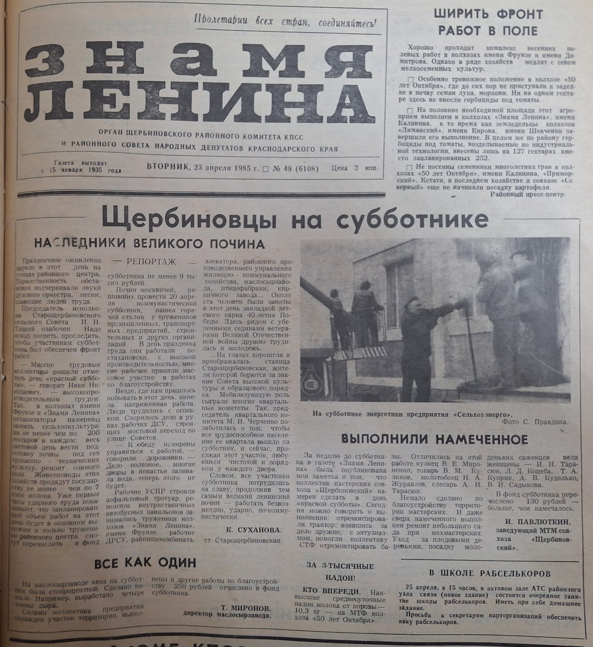 Специалистами архивного отдела подготовлена подборка из статей газеты «Знамя Ленина» от 23.04.1985 года в которых рассказывается о ходе субботника в станице Старощербиновской. В статье «Наследники великого почина» говорится: «Праздничное оживление царило в этот день на улицах районного центра. Торжественность обстановки подчеркивали звуки духового оркестра, песни славящие людей труда.