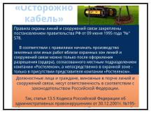 Данные действия образуют состав правонарушения, ответственность за которое предусмотрена частью 2 статьи 13.5 КоАП РФ, а именно нарушение Правил охраны линий и сооружений связи, утвержденных постановлением Правительства Российской Федерации от 9 июня 1995 г. № 578 (далее – Правила), вызвавшее прекращение оказание услуг связи.