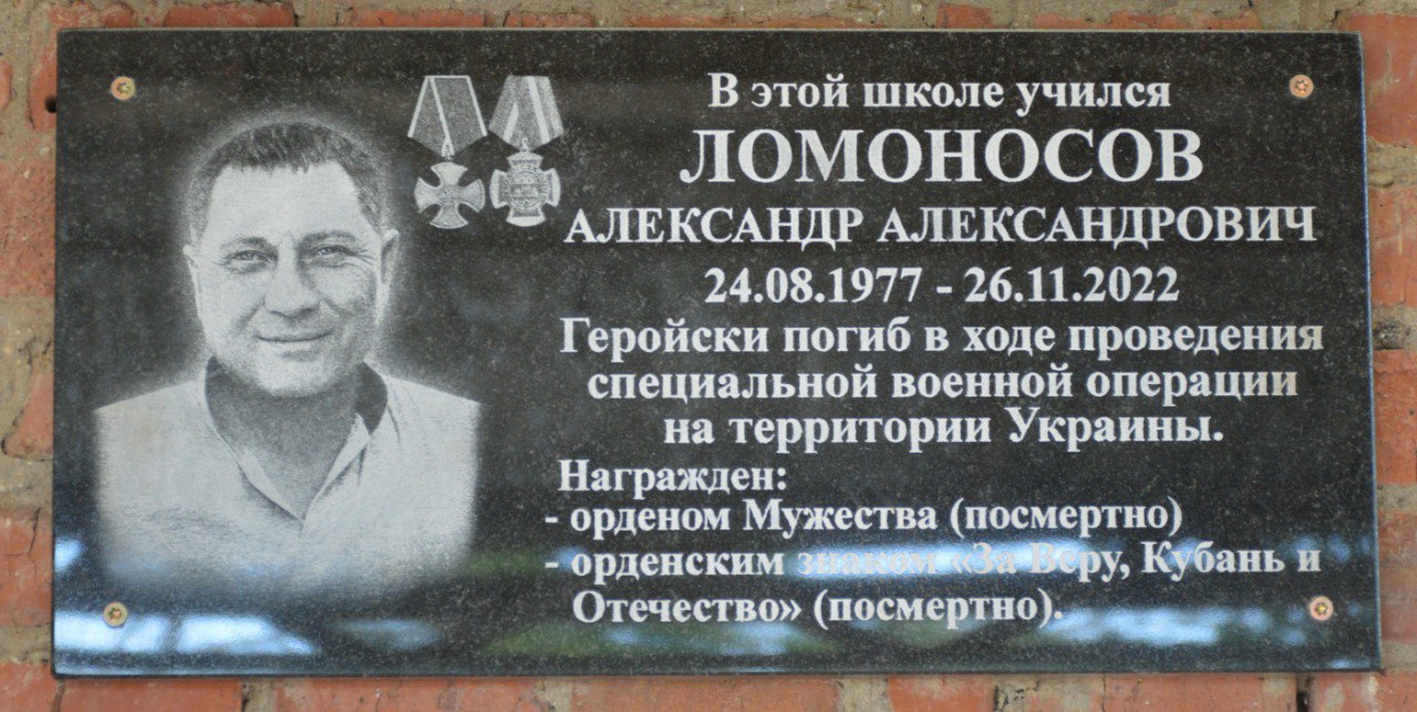 Ломоносов Александр Александрович родился 24 августа 1977 года в селе Ейское Укрепление. В 1994 году окончил школу, потом проходил воинскую службу. Александр был увлеченным молодым человеком, спортивным, отзывчивым и трудолюбивым. В 2022 году в составе казачьего добровольческого отряда БАРС отважно сражался на передовой. Погиб 26 ноября 2022 года в поселке Марьинка Донецкой Народной Республики. Награжден орденом Мужества (посмертно) и орденским знаком «За Веру, Кубань и Отечество» (посмертно).