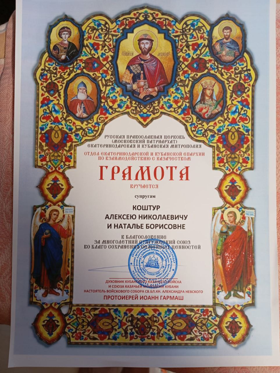 В рамках празднования Дня семьи, любви и верности заместитель Губернатора Краснодарского края, атаман Кубанского казачьего войска Александр Власов встретился с казачьими семьями региона. От нашего района в мероприятии приняла участие казачья семья Коштур. Праздничный день был начат в войсковом соборе святого благоверного князя Александра Невского. Духовник Кубанского казачьего войска и Союза казачьей молодежи протоиерей Иоанн Гармаш провел праздничный молебен. Казачьи семьи награждены грамотой в "Блогославление за многолетний супружеский союз" и иконой святых Петра и Феронии. Атаман войска пообщался с казачьими семьями, выслушал каждую семью.