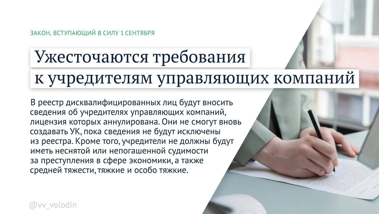 Теперь они не должны иметь неснятую или непогашенную судимость за ряд преступлений, в том числе в сфере экономики. Также учредители УК, лицензия которых аннулирована, не смогут вновь создать обслуживающую многоквартирные дома организацию до исключения из реестра дисквалифицированных лиц.
