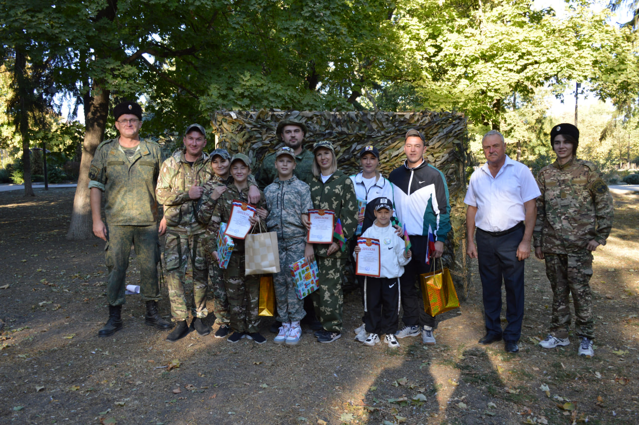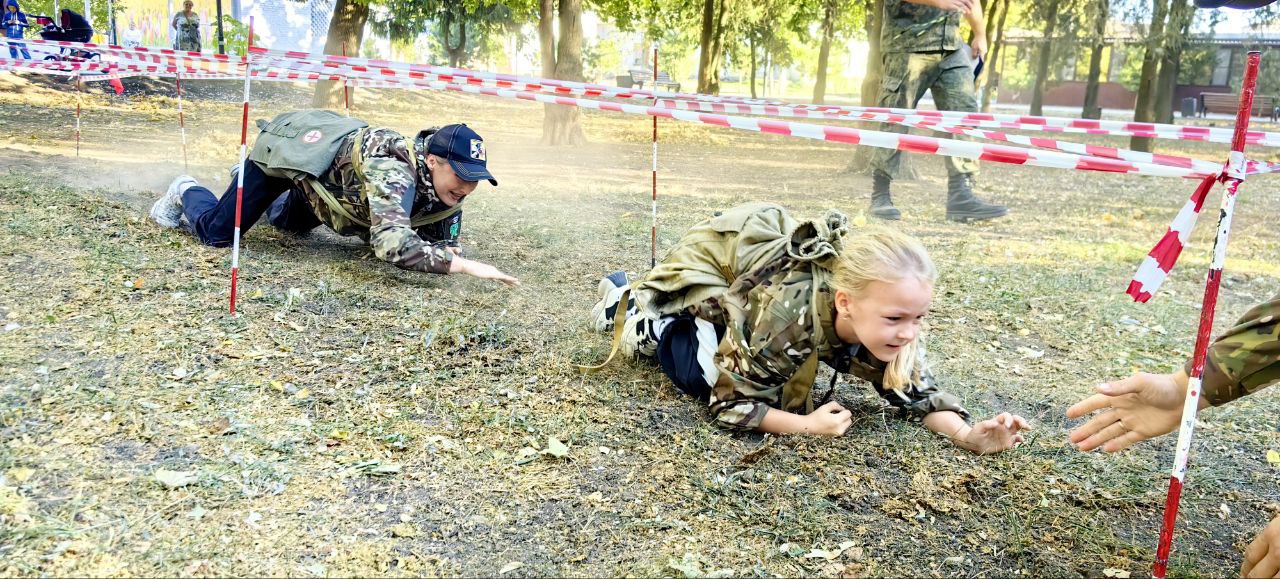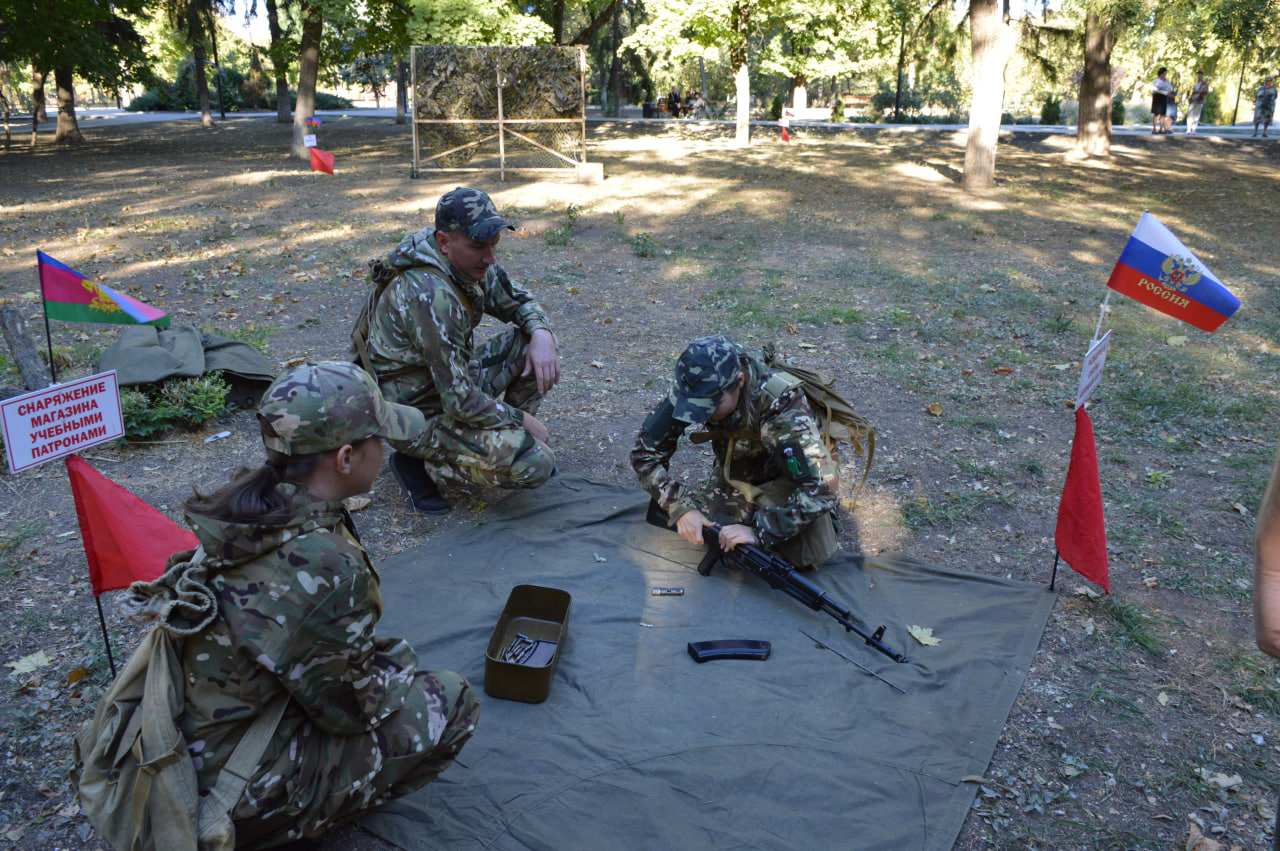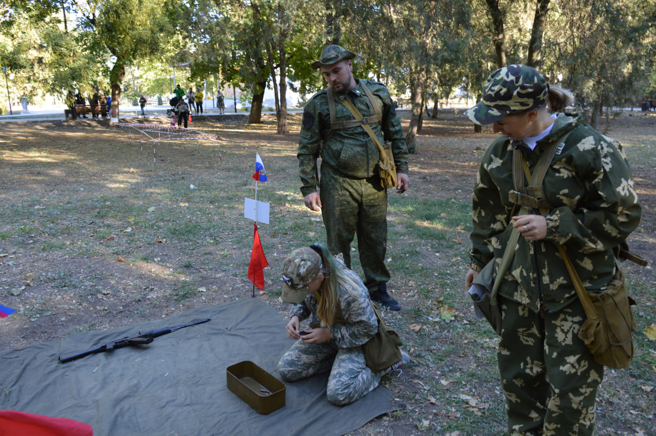Родители и дети участвовали в различных эстафетах: состязались в стрельбе из пневматической винтовки, разборке и сборке автомата Калашникова, оказании первой медицинской помощи, плетении маскировочной сети.