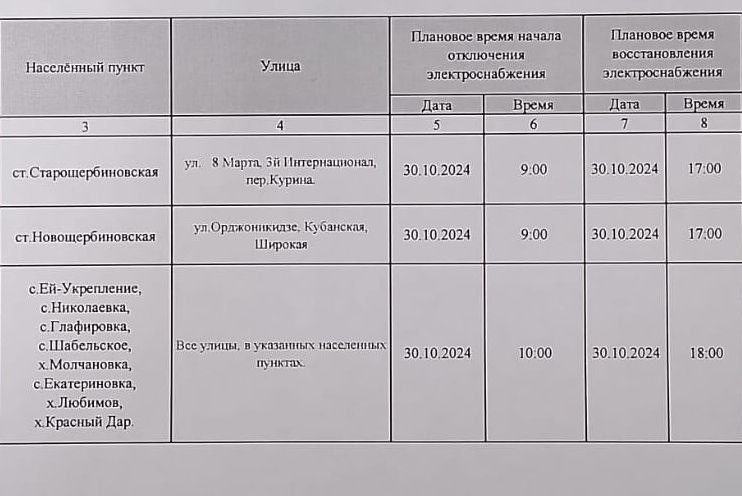 Для повышения надёжности электроснабжения потребителей района в осенне-зимний период необходимо выполнить усиление сварочных швов на металлической опоре, заменить дефектные изоляторы на ВЛ-35 кВ и провести ремонт оборудования. В связи с этим, ПАО «Россети Кубань» Ленинградские электрические сети сообщает, что 30 октября с 9.00 до 18.00 будет прекращена подача электроэнергии в селах Екатериновка, Шабельское, Глафировка, Николаевка, Ейское Укрепление, хуторах Молчановка, Любимов, Красный Дар.