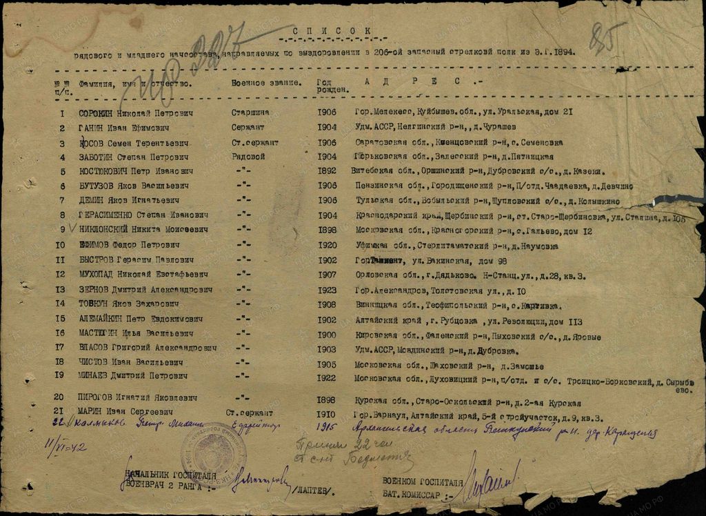 1074 стрелковый полк 314 стрелковой дивизии, 186 армейский запасной стрелковый полк, 1 гвардейская мотострелковая дивизия, 206 фронтовой запасной стрелковый фронт, эвакуационный госпиталь 1894, 1321 стрелковый полк 415 стрелковой дивизии.