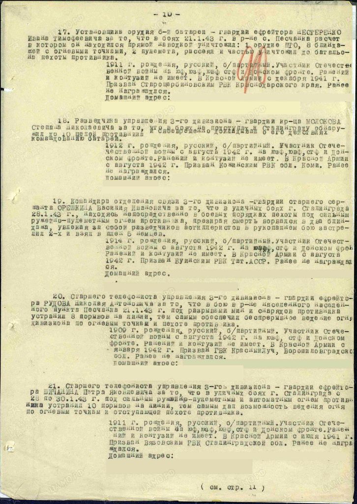 Нестеренко Иван Тимофеевич, родился и вырос в Краснодарский край, ст. Старощербиновская. В 1941 году был призван Старощербиновским РВК , Краснодарского края в ряды Красной Армии . Звание: гв. ефрейтор ; мл. сержант ; гв. мл. сержант. Был награжден: медаль «За боевые заслуги» (2); Орден Отечественной войны I степени; Медаль «За отвагу» (2); Медаль «За отвагу».