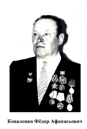 Фёдор Афанасьевич был призван в Армию в 1942 году. Воевал в городах Балта, Николаев, Херсон, Симферополь, Бахчи-Сарай. Был ранен. Лечился в госпитале г. Керчь. После госпиталя был 508 Краснознаменном зенитном батальоне. Был ранен в Керчи. За освобождение Керчи получил орден «Славы». Война для него закончилась в 1944 году 16 января. После войны работал механиком. На пенсии с 1977 года по инвалидности, 3-я группа. Имеет награды «60 лет Вооружённых Сил», «50 лет Вооружённых Сил», «30 лет Победы», «20 лет Победы», «100 лет со дня рождения В.И. Ленина».