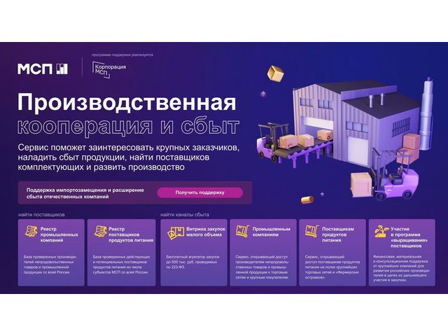 Для этого на Цифровой платформе МСП.РФ работает сервис «Производственная кооперация и сбыт». Он, с одной стороны, собирает и систематизирует сведения об отечественных МСП-производителях непродовольственных товаров, а с другой — запросы на закупку и потребности в продукции от российских и зарубежных заказчиков и ритейлеров.