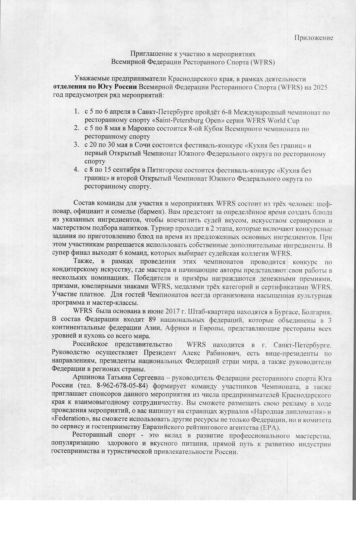 Приглашение к участию в мероприятиях Всемирной Федерации Ресторанного Спорта (WFRS). В рамках деятельности отделения по Югу России Всемирной Федерации Ресторанного Спорта (WFRS) на 2025 год предусмотрен ряд мероприятий: