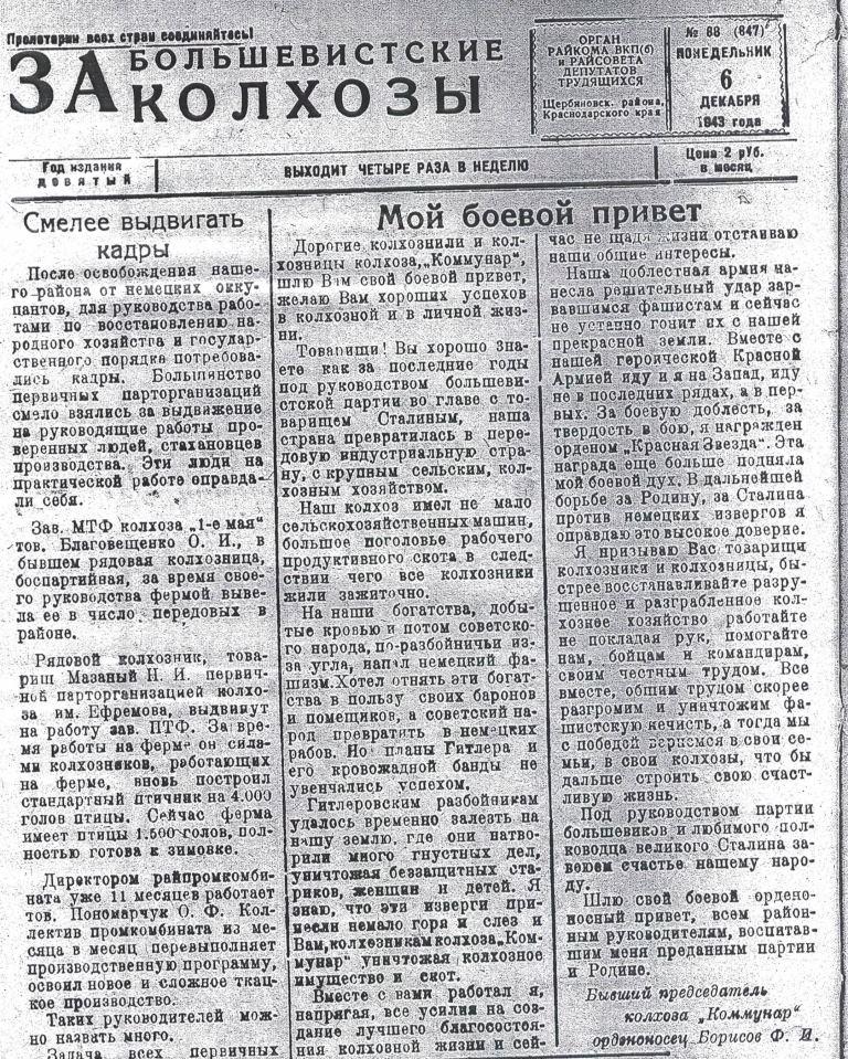 Так в районной газете «За большевистские колхозы» № 88 от 6 декабря 1943 года опубликовано письмо бывшего председателя колхоза «Коммунар» Борисова Ф.И., находящегося на фронте: