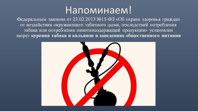 Обращаем внимание, что запрет курения кальянов и никотинсодержащей продукции направлен на предупреждение заболеваний, связанных с воздействием окружающего табачного дыма и веществ, выделяемых при потреблении никотиносодержащей продукции и распространяется на любые кальяны, а также на широкий спектр никотинсодержащей продукции, в том числе электронные испарители, электронные сигареты, «вейпы», «IQOS», «glo», «REVO» и т.д.