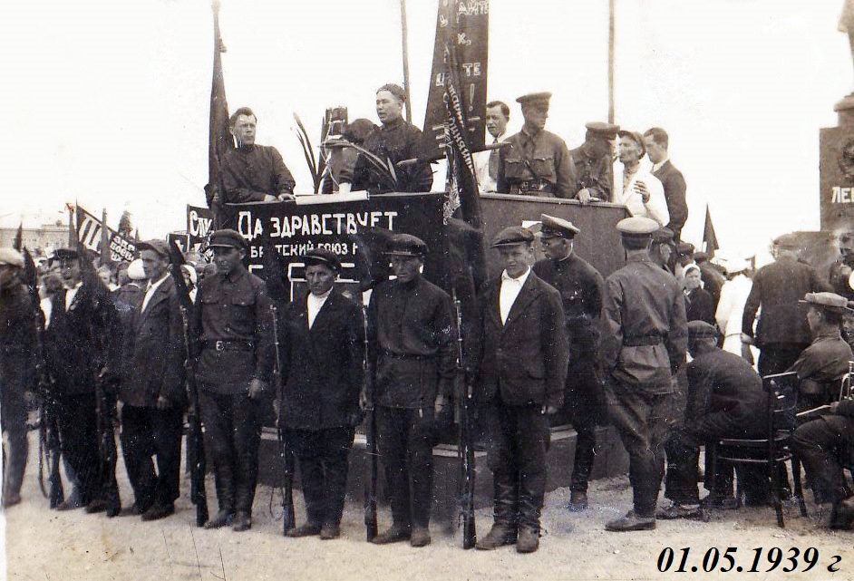 1 мая – праздник весны и труда. Он символизирует трудовую солидарность, созидание, стремление достойно трудиться, обеспечивая уверенность в завтрашнем дне. В нашем Щербиновском районе, как во всей стране, этот день сопровождался митингами и демонстрациями. Сохранились старые фотографии, которые запечатлели Первомай в станице Старощербиновской в годы до начала Великой Отечественной войны 1941-1945 гг. Рассматривая их, мы видим, что все мероприятия традиционно проводились на Центральной площади станицы Старощербиновской у памятника Ленину. Люди, запечатленные на фото, еще не знают, что скоро начнется война, и в их судьбы ворвется горе (из материалов собственной собирательной деятельности Щербиновского районного отделения РОИА).