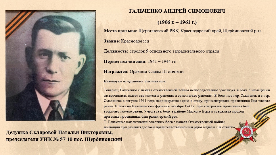 ГАЛЬЧЕНКО Андрей Симонович - дедушка Натальи Скляровой, председателя УИК № 57-10 пос. Щербиновский