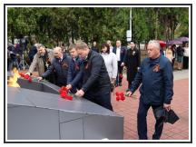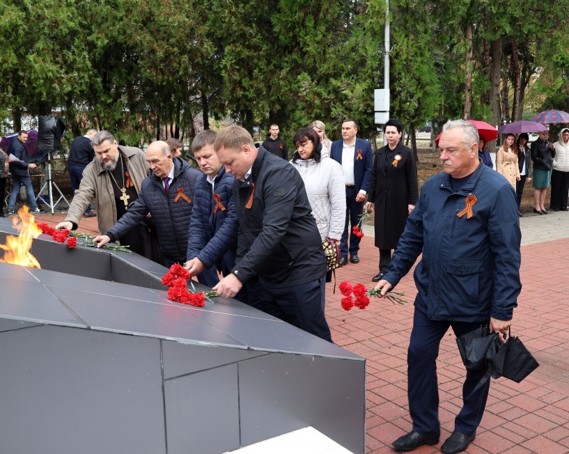 В память о тех, кто отдал свои жизни во имя Победы, была объявлена минута молчания, возложены живые цветы к Вечному огню, и корзины цветов к памятникам труженикам тыла и расстрелянным мирным жителям в период оккупации Щербиновского района.