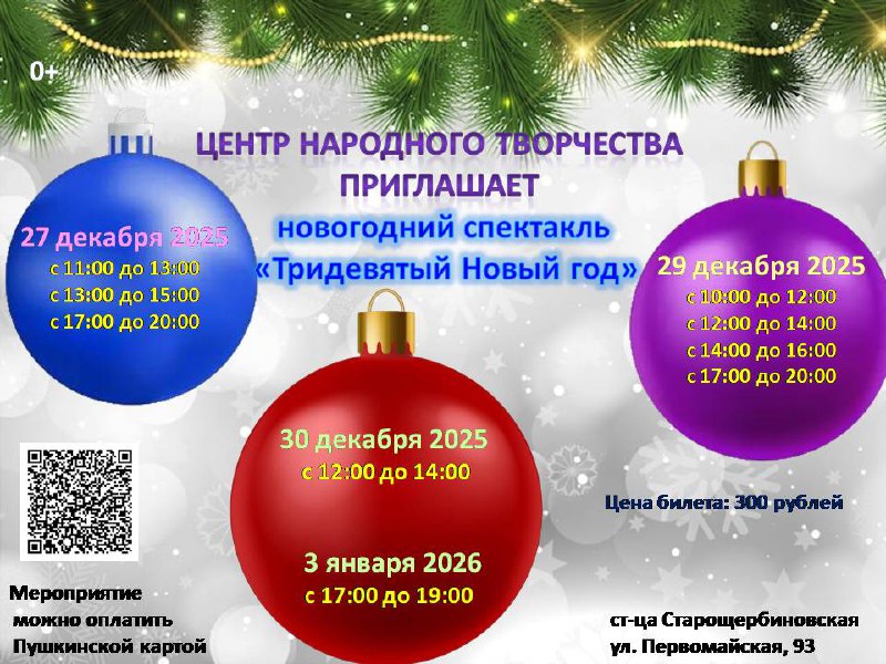 Дорогие друзья! Все ближе новогодние праздники! Мы уже вовсю готовимся, а вы уже продумали, чем займетесь? Приглашаем вас в Центр народного творчества на волшебный спектакль "Тридевятый новый год" Вместе с главными героями — братьями Ильёй, Ваней и их подружкой Варей — вы победите зло, а добрый Дед Мороз исполнит ваши заветные желания! Сюжет спектакля не оставит равнодушным ни детей, ни взрослых! В программе: - Весёлые игры - Забавные конкурсы - Встречи со сказочными персонажами Билеты можно приобрести по ссылке или QR-коду, лично в нашем центре или оплатить Пушкинской картой Ссылка на приобретение билетовhttps://widget.afisha.yandex.ru/w/venues/73721?clientKey=07bc5104-581a-456b-bd87-18800ad885b2 #НовыйГод #ЦентрНародногоТворчества #СказочныйСпектакль #НовогоднееНастроение #ЗажигаемЗвезды #ДетямВзрослымВсегда #ЛюбовьИскусству #ПушкинскаяКарта #ТеатрДети #НовогодняяВолшебница