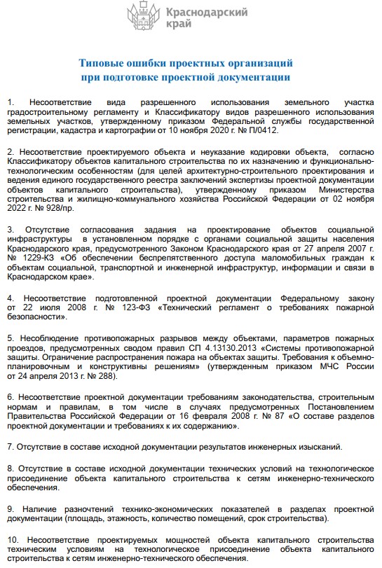 Департаментом по архитектуре и градостроительству Краснодарского края разработан перечень типовых ошибок проектных организаций при подготовке проектной документации.