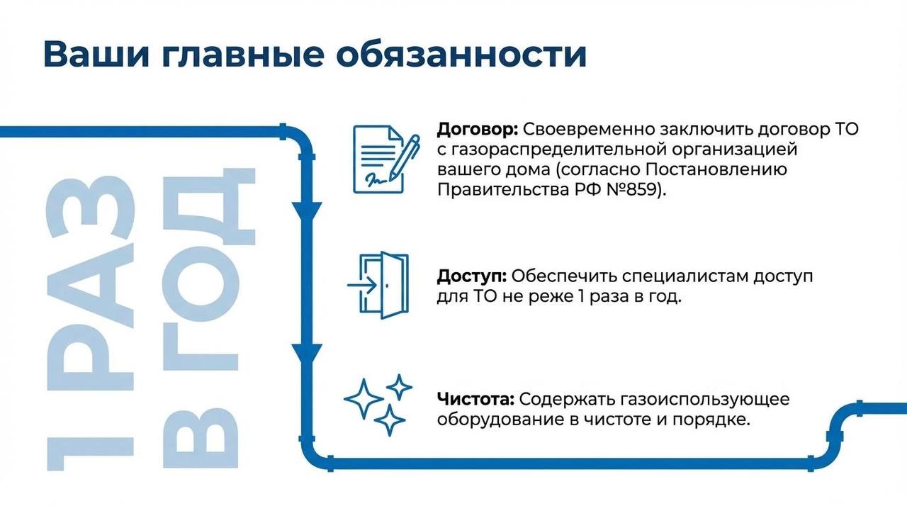 В карточках собрали краткую памятку для владельцев жилья: что относится к бытовому газовому оборудованию, какие обязанности есть у собственника, как подготовиться к визиту специалиста и на что обратить внимание после завершения технического обслуживания.