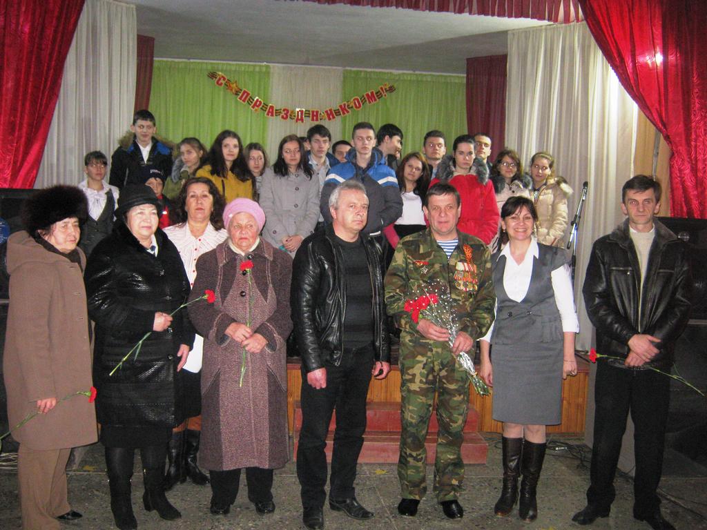 Участники самодеятельности Григорьева Галина и дуэт Д. Зарытых и Д. Шейбе подарили трогательные песни, ветеран боевых действий в Чечне Настюшин А. представил свою авторскую песню под гитару. В финале встречи прозвучали такие многозначительные слова: пусть вам сегодня жизнь подарит счастье…избавит пусть от горя и напастей, оставив только самый светлый след...