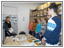 Экскурсию для ребят провели начальник архивного отдела С.В. Терещенко и ведущий специалист Л.В. Гончаренко. Ребята узнали, что первые архивы появились в XIV-XV вв. Это не были архивы в сегодняшнем понимании этого слова. Документы хранились при церквях и монастырях вместе с ценными вещами и книгами. Доказательством этому стали показанные учащимся метрические церковные книги. И лишь при Петре I в государстве появилась такая должность, как архивариус. Рассказ велся и о современных архивах, их видах и о том, на сколько лет могут засекречиваться документы, содержащие государственную тайну или сведения конфиденциального характера.