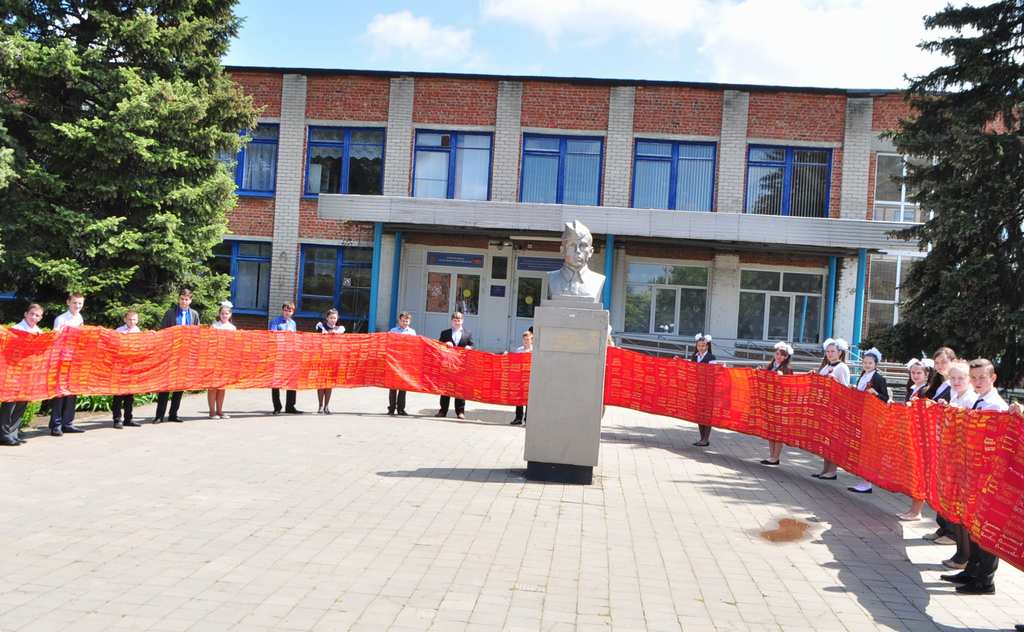 После завершения «Вахты Памяти» во дворе школы старшеклассники растянули Полотно рядом с бюстом Героя Советского Союза