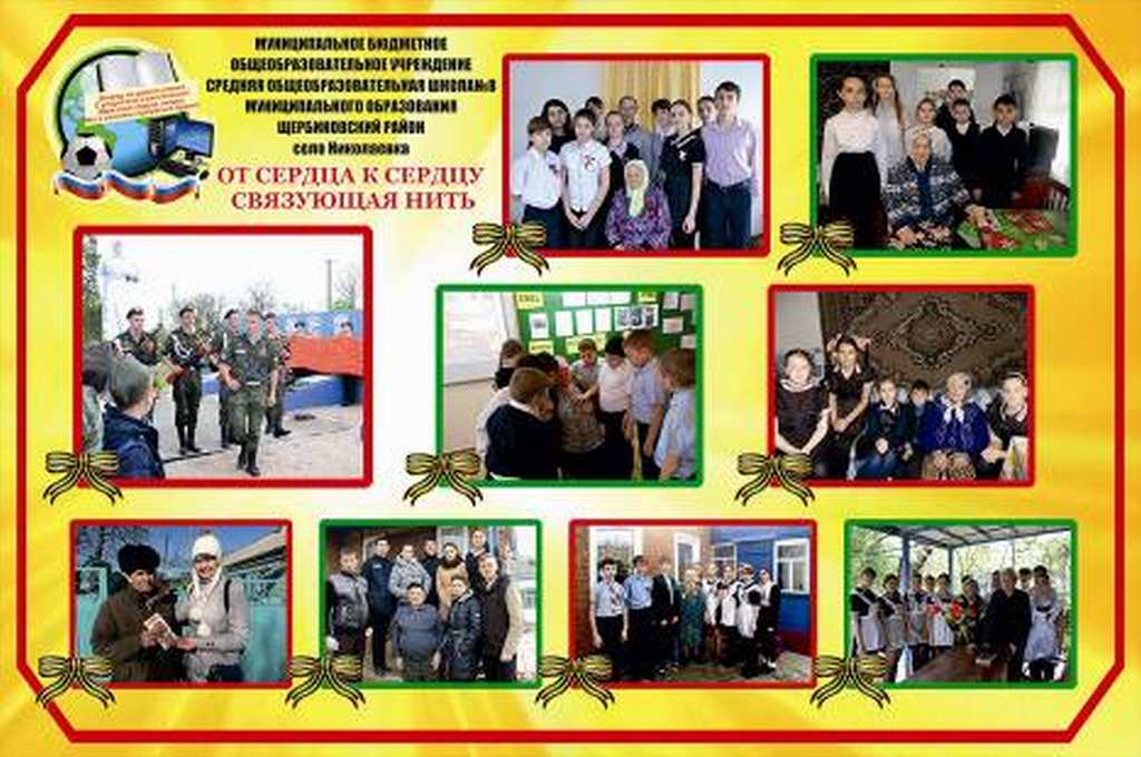 В рамках празднования 71-й годовщины Победы в Великой Отечественной войне 1941-1945 годов все общеобразовательные учреждения муниципального образования Щербиновский район участвовали в муниципальном проекте «От сердца к сердцу связующая нить», продуктом которого стали, размещенные во всех школах на фасадах зданий баннеров с надписью «От сердца к сердцу связующая нить», с фотографиями ветеранов Великой Отечественной войны и тружеников тыла.