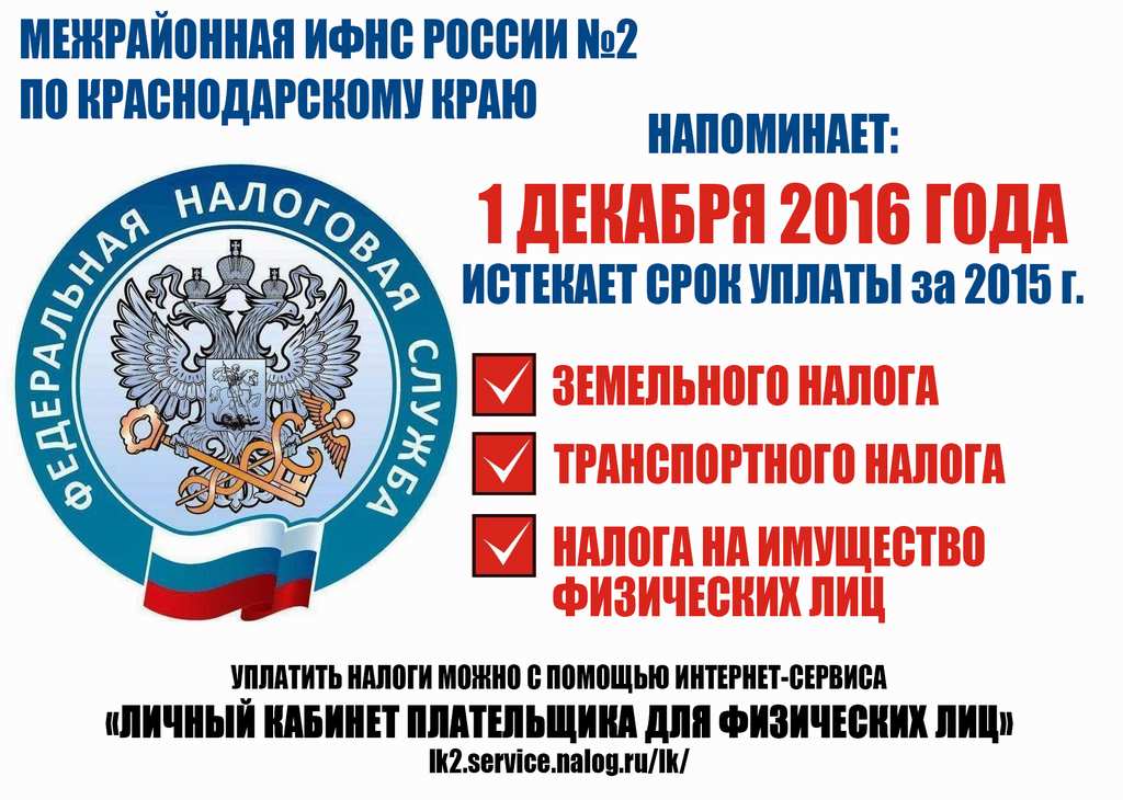 Налоговая служба напоминает, что в 2016 году на всей территории Российской Федерации действует единый срок уплаты имущественных налов за 2015 год - не позднее 1 декабря 2016 года.