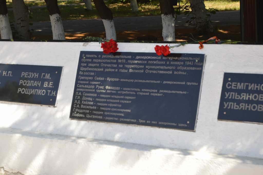 Сегодня, по инициативе членов Щербиновского отделения РОИА, на Мемориальном комплексе в честь земляков, погибших в годы гражданской и Великой Отечественной войн в станице Старощербиновской торжественно была открыта плита в память о разведывательно-диверсионной интернациональной группе парашютистов № 10, героически погибших в январе 1943 года при защите Отечества на территории муниципального образования Щербиновский район в годы Великой Отечественной войны. В состав разведывательно-диверсионной интернациональной группы парашютистов входили: Грегорио Сейхо – Куэрва – командир разведывательно-диверсионной группы, старший сержант; Сальвадор Руис Фахардо – заместитель командира разведывательно-диверсионной группы, летчик - истребитель, старший сержант; П.А. Семенов – гвардии младший сержант; Г.Я. Донец - гвардии младший сержант; Я.Д. Хайлов – гвардии ефрейтор; С.А. Васильев – гвардии красноармеец; Г. Федотов - гвардии красноармеец; Любовь Цыганова – радистка – разведчица. Трое из них захоронены в станице Старощербиновской.