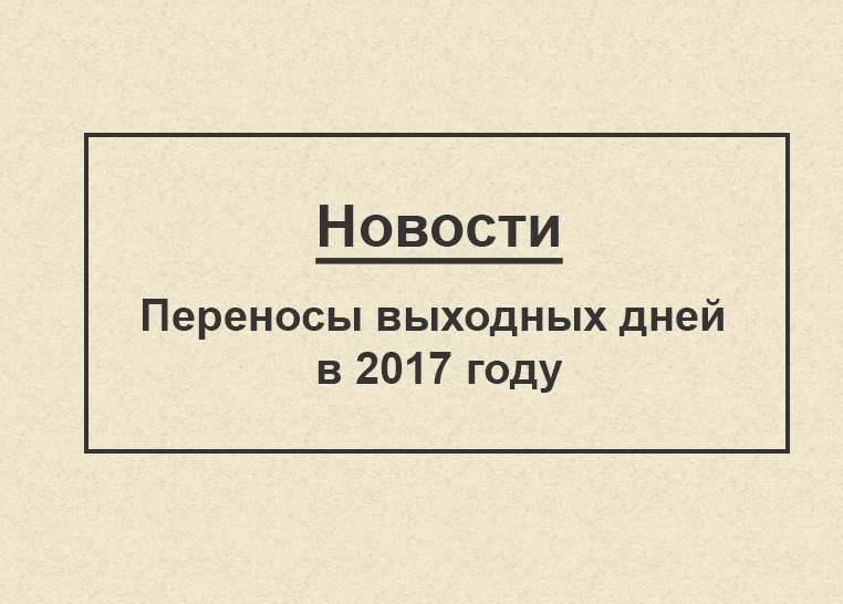 Для применения в работе, доводим до сведения работодателей и работников (их представителей) копию постановления Правительства Российской Федерации от 4 августа 2016 года № 756 «О переносе выходных дней в 2017 году» / опубликовано на официальном интернет - портале правовой информации (www.pravo.gov.ru) 6 августа 2016 года (вступило в силу 14.08.2016)/.