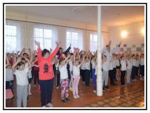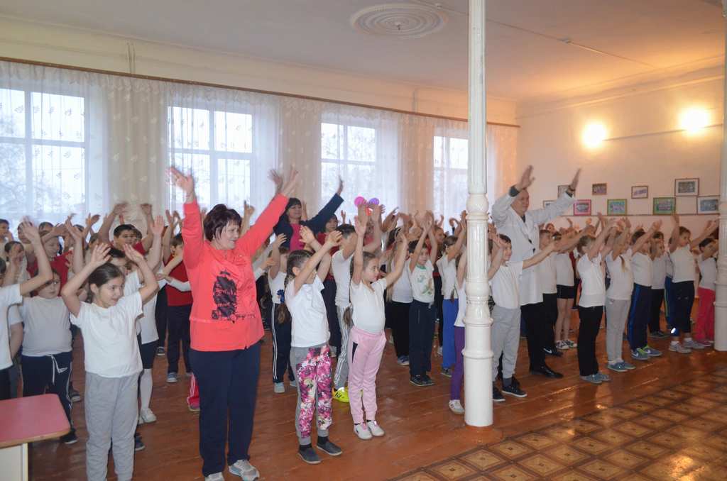 В школе № 1 им. Ляпидевского ст. Старощербиновская ученики начальной школы делали зарядку вместе с начальником управления образования Л.И. Городицкой, врачом-наркологомВ.Н. Костенко, директором школы Л.В. Гарькавой.