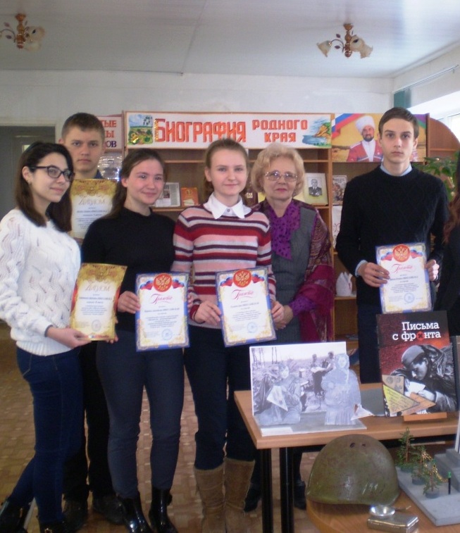 Вечер памяти «Солдатские письма - треугольники жизни» собрал в читальном зале Межпоселенческой библиотеки старшеклассников СОШ №2. С большим вниманием слушатели восприняли литературно- поэтическую композицию о письмах – подлинниках наших земляков, присланных в станицу в годы Великой Отечественной войны. Особое волнение вызвала выставка – инсталляция «Я пока жив…», на которой были представлены пробитая пулей солдатская каска, фляга, планшет, красноармейская книжка 1944 года, фронтовые письма земляков за 1942-1943 годы. Большой интерес проявили слушатели к слайд - презентации «Письма, опаленные войной».