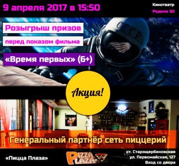 Кинотеатр «Родина» приглашает всех жителей района 9 апреля в 15:50 на показ героического фильма «Время первых». Перед показом фильма пройдёт самый вкусный и самый приятный розыгрыш призов, от спонсора – сети пиццерий «Пицца Плаза!».
