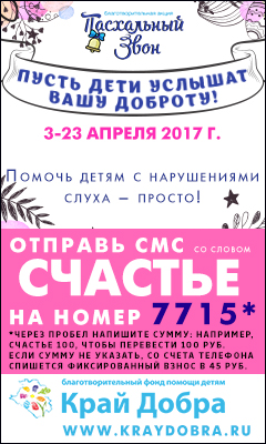 В преддверии большого и светлого праздника Пасхи «Край добра» проводит акцию «Пасхальный звон», чтобы подарить детям счастье слышать этот мир! Присоединяйтесь к акции, чтобы помочь тяжелобольным детям услышать пасхальный звон и изменить их жизнь - жизнь, в которой появятся голоса родных, смех друзей, пение птиц и звуки природы! Пусть вашу доброту услышат дети!
