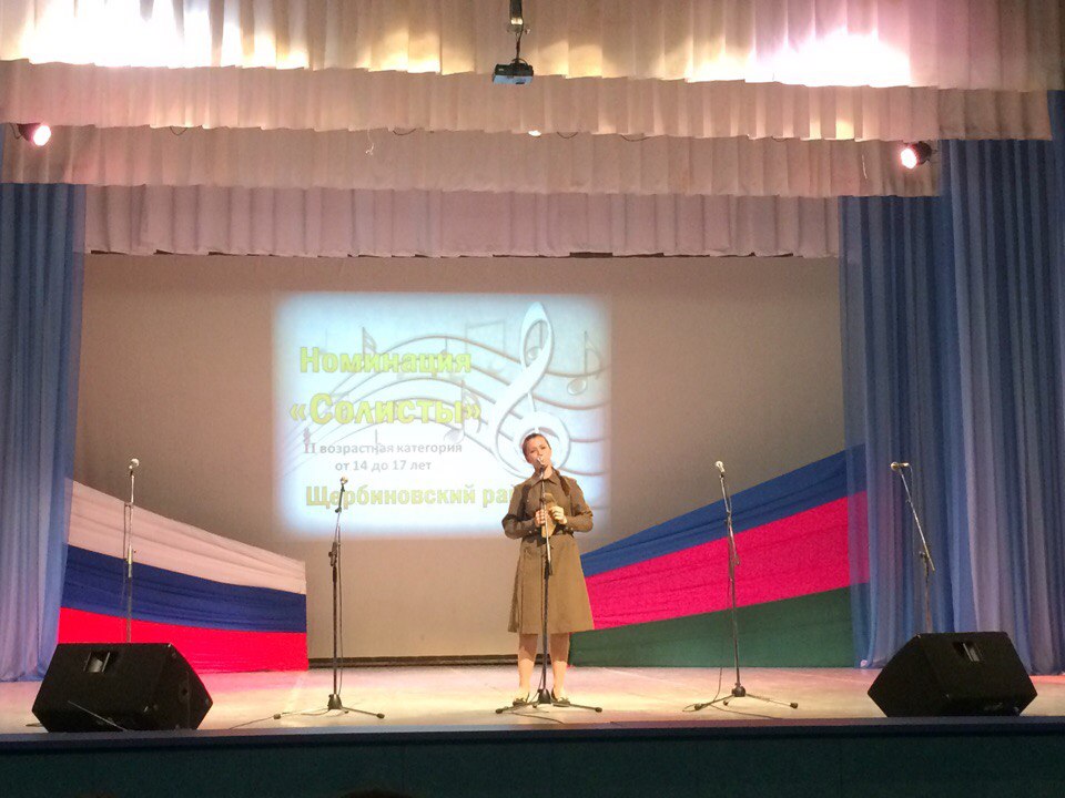 19 апреля в станице Брюховецкой состоялся зональный этап XVI краевого фестиваля героико-патриотической песни "Пою мое Отечество", на котором выступили финалисты муниципального этапа Гринева Антонина в номинации "Соло" и вокальный коллектив "Россияночка" Валерия Бурделева и Виолетта Казанцева в номинации «Ансамбль».