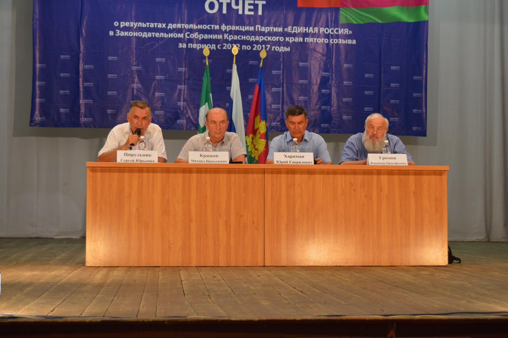 В Центре народного творчества станицы Старощербиновской прошла встреча члена фракции Партии "ЕДИНАЯ РОССИЯ" в Законодательном Собрании Краснодарского края Юрия Гавриловича Харамана с жителями района. На встрече был рассмотрен отчет о работе фракции Партии "ЕДИНАЯ РОССИЯ" в Законодательном Собрании Краснодарского края за период с октября 2012 года по июнь 2017 года, обсуждены задачи на предстоящий период. Во встрече, которую провёл Секретарь Щербиновского местного отделения Партии «ЕДИНАЯ РОССИЯ» Сергей Юрьевич Цирульник, приняли участие: член фракции Партии "Единая Россия" в Законодательном Собрании Краснодарского края Юрий Гаврилович Хараман, член фракции Всероссийской политической партии "Единая Россия», заместитель председателя комитета по военным вопросам, безопасности, воспитанию допризывной молодежи и делам казачества Владимир Прокофьевич Громов, руководитель фракции партии «Единая Россия» в Совете муниципального образования Щербиновский район Михаил Николаевич Кряжов, работники, представляющие все сектора экономики и социальной сферы района. «Продуманная и чётко выстроенная за эти годы законодательная база края, а также совместная, слаженная работа "единороссов" Кубани, органов краевой власти и местного самоуправления, всех ее тружеников позволили, несмотря на все трудности, достигнуть позитивных результатов в экономике, социальной сфере и повышении качества жизни людей. В сравнении с 2012 годом валовой региональный продукт увеличился почти в 2 раза и достиг в прошлом году более 2,2 триллиона рублей. Это шестой результат среди регионов России. За пять лет в экономику края вложено около 3 триллионов рублей, что позволило обновить технологии, увеличить количество новых предприятий и дополнительно создать свыше 18 тыс. рабочих мест»,- в своём выступлении отметил Юрий Гаврилович. Работа фракции за отчетный период была признана положительной.