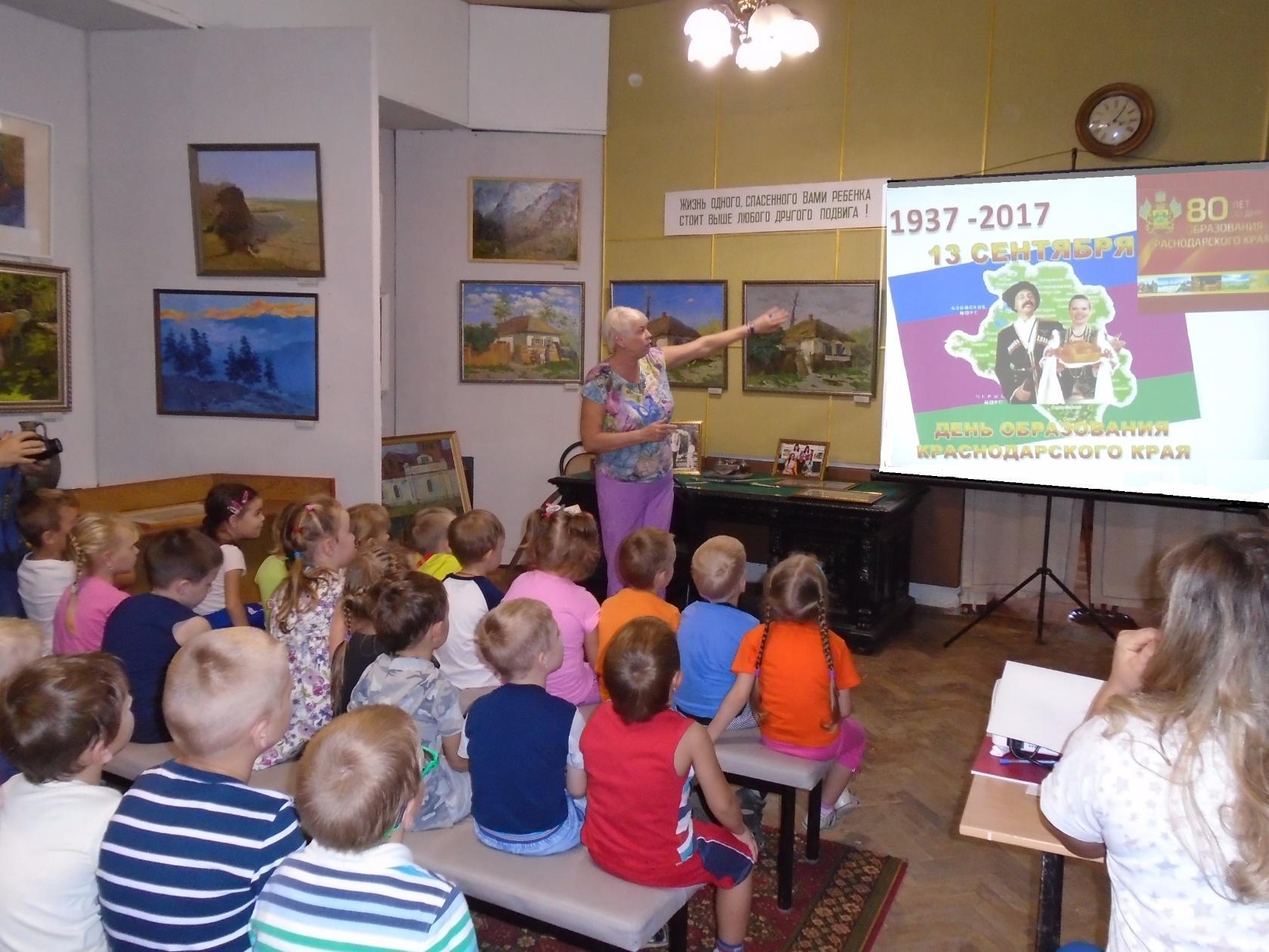 В день 80-летия Краснодарского края в историко-краеведческом музее им.М.М.Постернак для ребят состоялась презентация и тематическая экскурсия « С днем рождения, любимый край!», познавательно-развивающая игра по сбору пазлов «Костюм казака и казачки». Ребята активно участвовали в игре, а победители получили призы