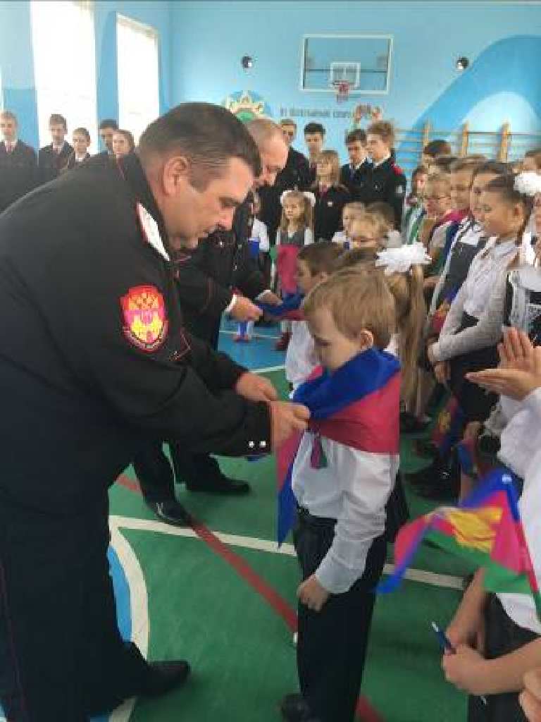 Во время торжественной линейки юные казачата дали клятву, после чего, казаки Старощербиновского казачьего общества повязали им галстуки.