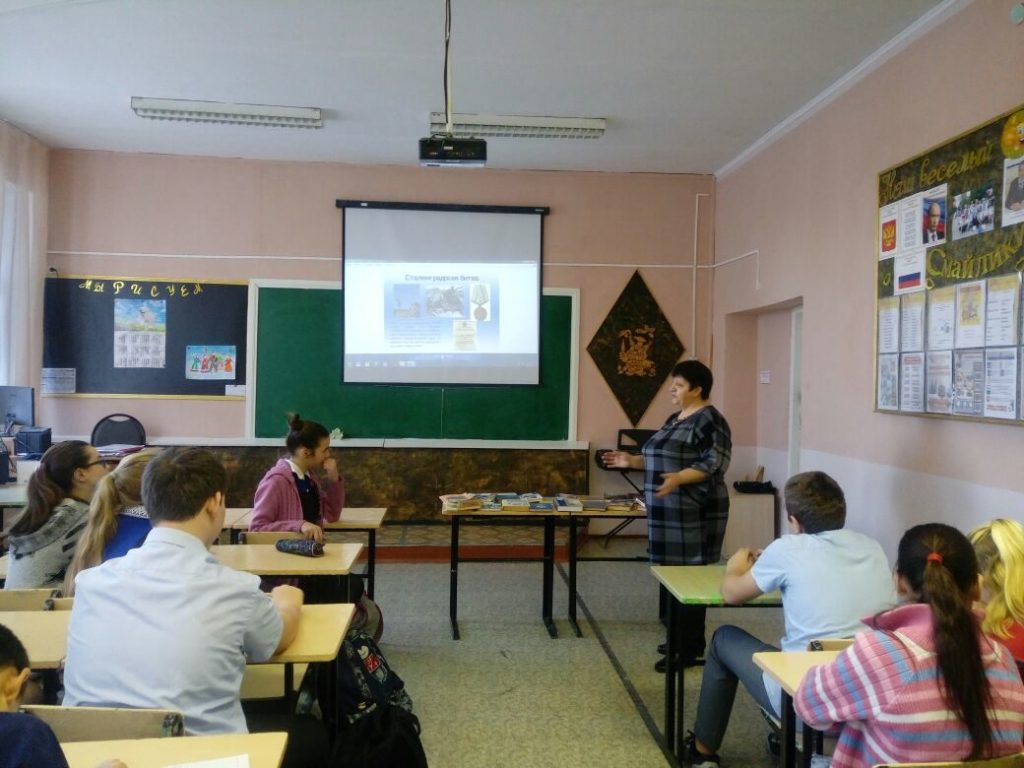 На базе СОШ № 6 прошёл час истории «Память о Сталинграде в наших сердцах» для учащихся 7-го класса. Библиотекарь Вера Николаевна рассказала ребятам об истории Сталинградского сражения и познакомила с биографиями наших земляков - участников Сталинградской битвы. Мероприятие сопровождалось презентаций об ожесточенной обороне города от немецких войск. К часу истории была подготовлена книжная выставка «Вечный огонь Сталинграда». Подводя итог часа истории, ребята пришли к выводу, что действительно «Судьба Великой Отечественной войны решалась в Сталинграде».