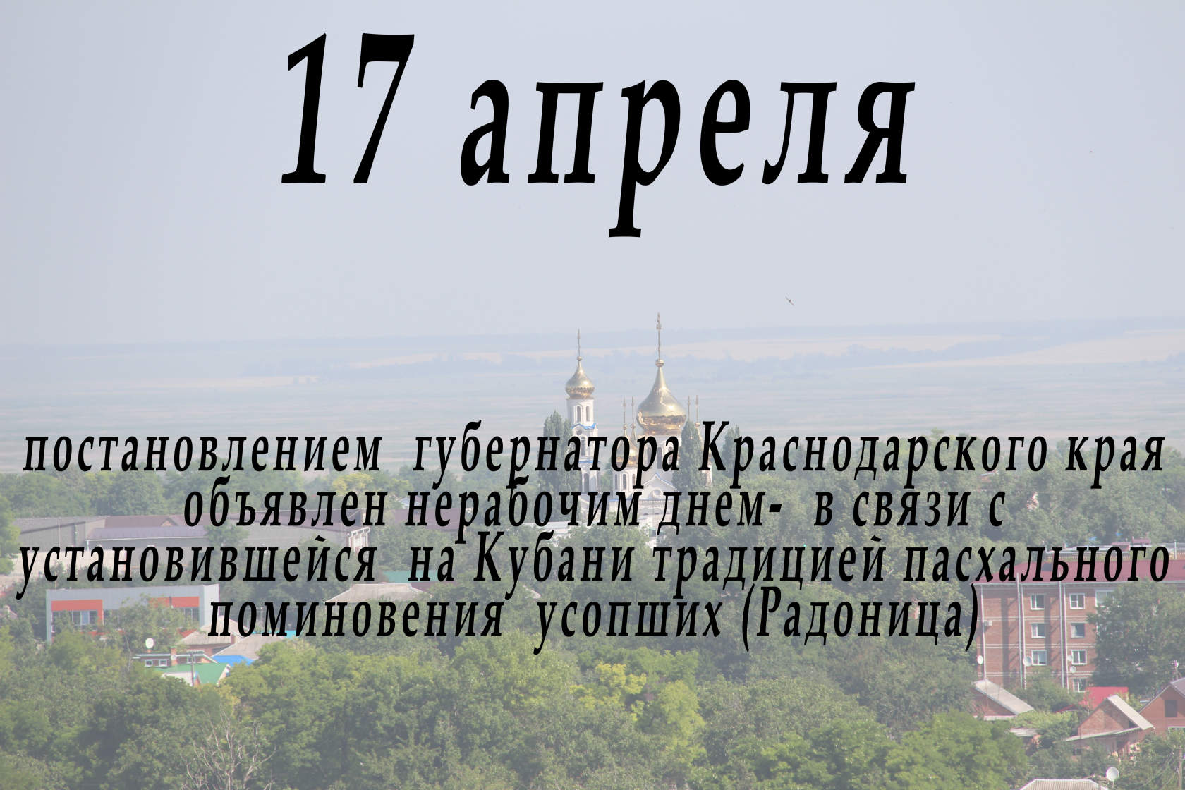 Уважаемые жители района. Обратите внимание на то, что постановлением главы администрации (губернатора) Краснодарского края от 30 марта 2018 года в связи с установившейся на Кубани традицией пасхального поминовения усопших (Радоница) 17 апреля объявлен нерабочим днем.