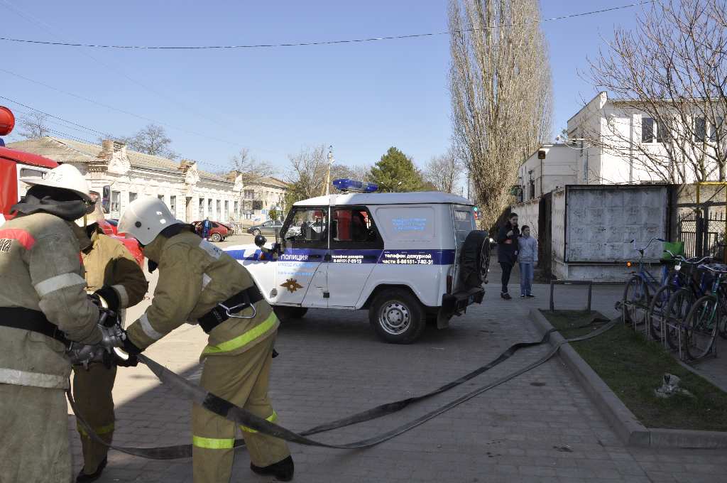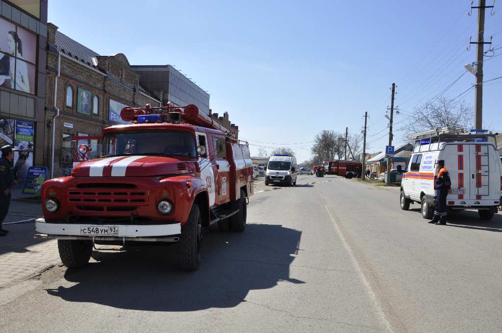 По тактическому замыслу учений, в результате короткого замыкания электропроводки в одном из отделов магазина «Магнит», расположенного в торговом центе «Старая мельница», произошел пожар. При его обнаружении сработала пожарная сигнализация. Сотрудник магазина, сообщил о пожаре на пожарно-спасательную часть № 132 по обслуживанию ст. Старощербиновской, оттуда в свою очередь поступили звонки во все службы района. Сотрудники полиции и пожарный расчет прибыли одновременно в течение трех минут. Заместитель начальника ПСЧ -132 капитан внутренней службы Игорь Кортишко, в течении нескольких секунд провел разведку для изучения ситуации и дал команду: «Приступить к тушению пожара». В течении пяти минут с момента поступления информации о возгорании в торговом центре, на место тушения прибыли сотрудники МЧС, Скорая медицинская помощь, аварийно – спасательная служба, аварийно – газовая служба. Сотрудники МЧС, сотрудники аварийно – спасательной службы приступили к оказанию помощи полицейским в эвакуации сотрудников и посетителей торгового центра, сотрудники – газовой службы незамедлительно перекрыли подачу газа в торговый – центр, медики оказывали помощь условным пострадавшим.
