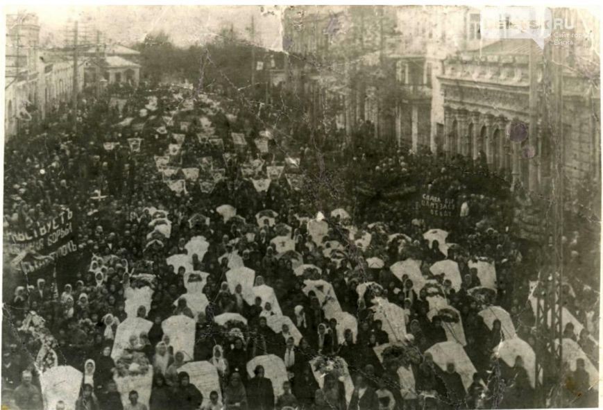 «…Через 4 дня после восстания, собранных детей, стариков, женщин из всех станиц, участвовавших в восстании, заставили идти пешком в г.Ейск и нести лозунги и красные флаги.