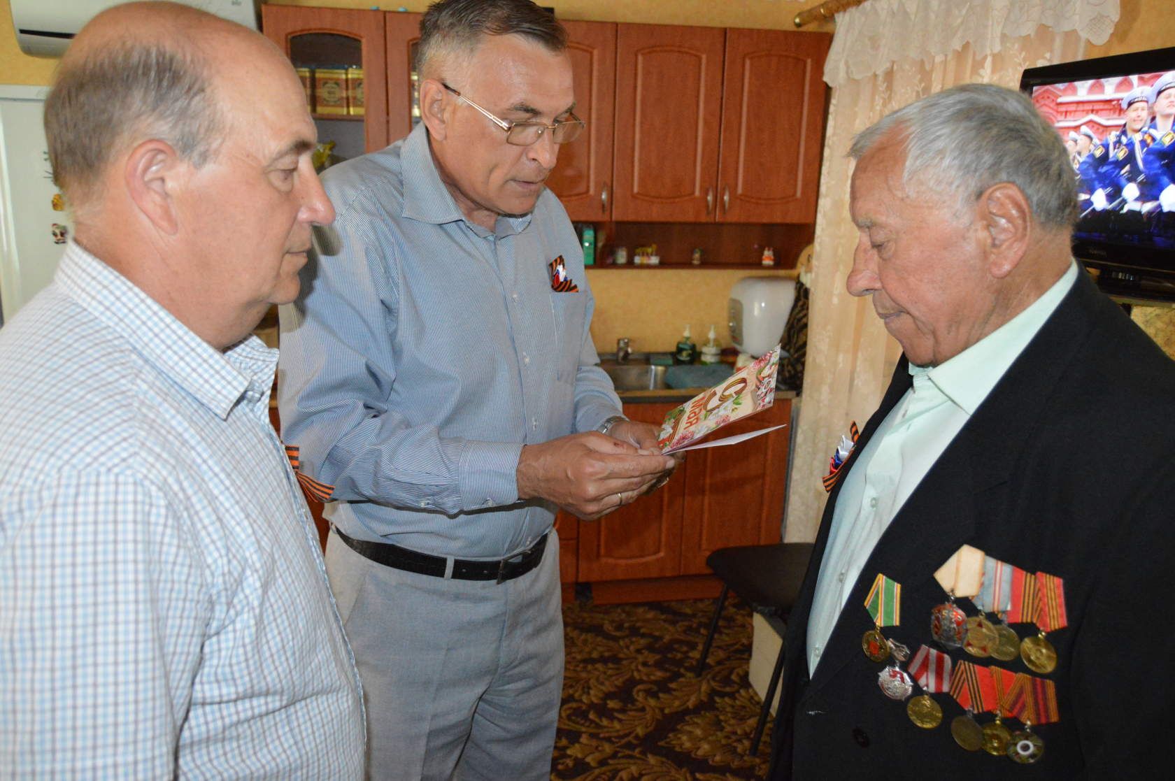 Сегодня глава района Сергей Цирульник и председатель Щербиновского районного совета ветеранов Михаил Кряжов поздравили наших дорогих ветеранов с главным, особо чтимым праздником нашей страны – Днем Великой Победы. "Я очень горд тем, что у меня есть уникальная возможность пообщаться с нашими героями- великими людьми… Время неумолимо. Сегодня в нашем районе проживает 13 участников Великой Отечественной войны. Всё дальше уходит он нас война…Но сколько бы лет ни минуло, память о войне будет жить, как будет жить наша благодарность тем, кто защитил мир от фашизма, благодаря кому сегодня мы трудимся, растим детей и радуемся солнцу",- отметил Сергей Юрьевич.
