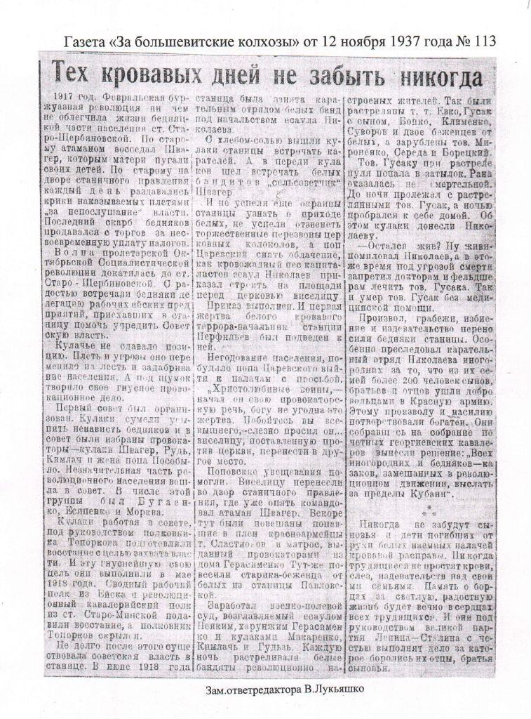 Из статьи В.Лукьяшко «Тех кровавых дней не забыть никогда», опубликованной в районной газете «За большевистские колхозы» 12 ноября 1937 года:
