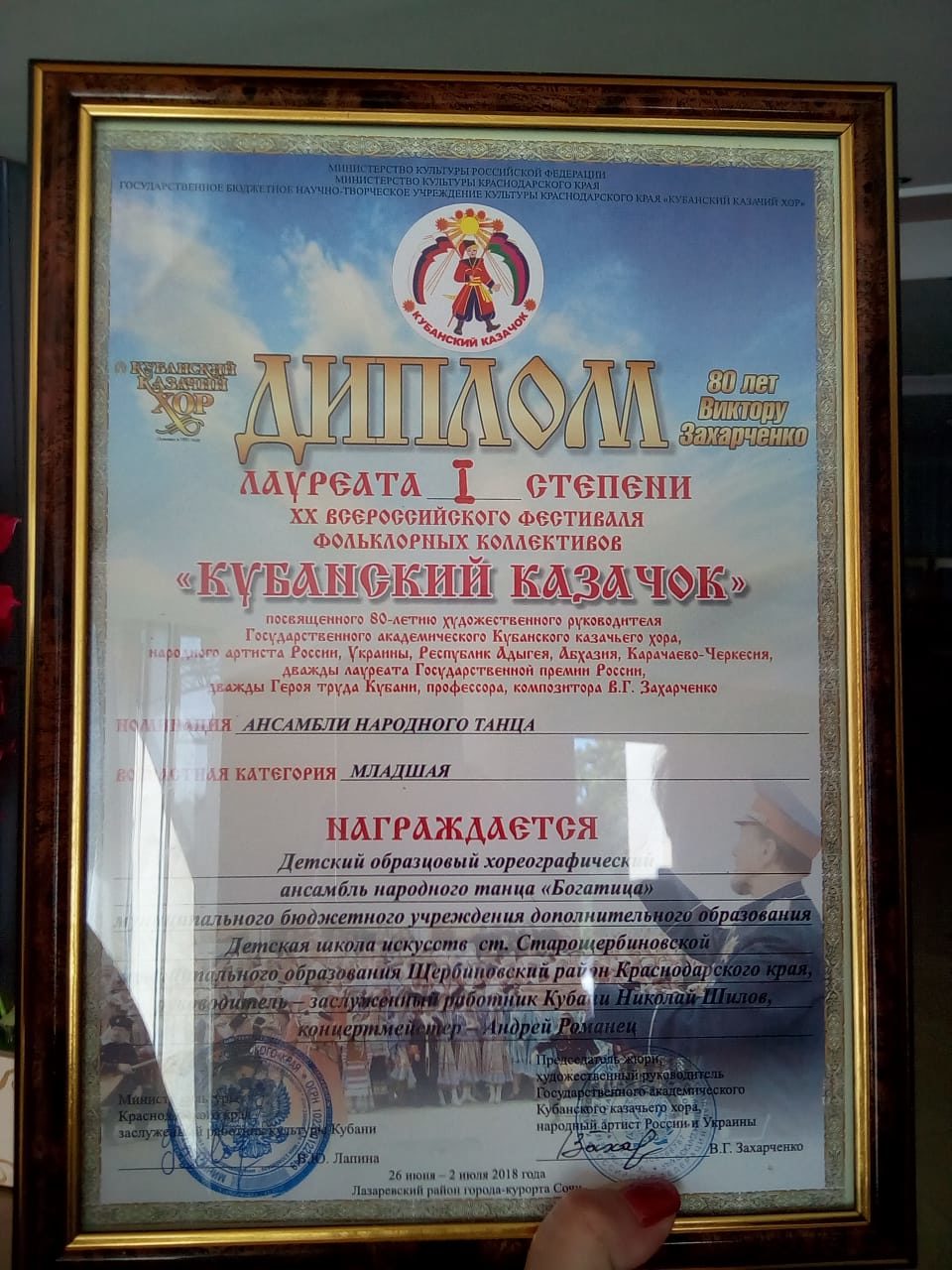 С 25 по 30 июня в Лазаревском районе г-к.Сочи проходил заключительный этап XX Всероссийского фестиваля фольклорных коллективов «Кубанский казачок». И вот объявлены результаты! Наш детский образцовый хореографический ансамбль народного танца «Богатица» стал победителем Всероссийского фестиваля! Руководитель коллектива - заслуженный работник Кубани Николай Шилов. Мы поздравляем наших ребят с грандиозной победой!