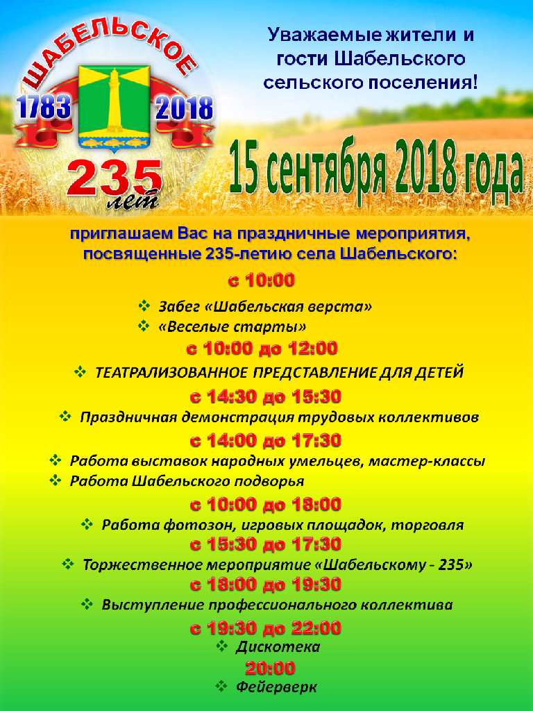 Приглашаем вас 15 сентября на праздничные мероприятия, посвящённые 235-летию села Шабельское.
