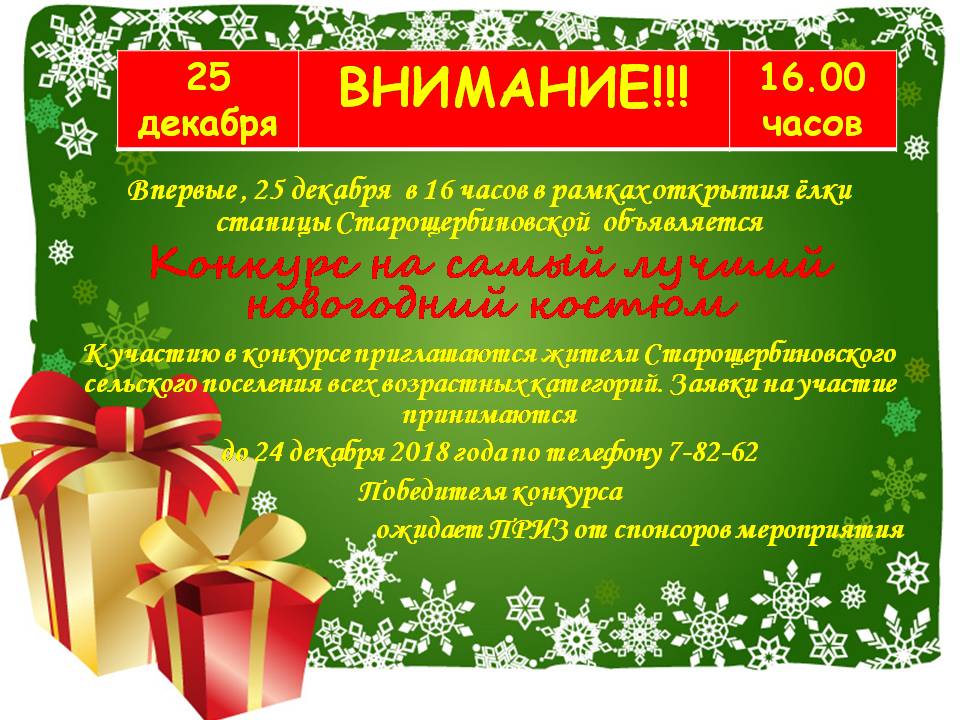 В рамках открытия новогодней ёлки с в станице Старощербиновской, 25 декабря пройдёт конкурс на самый лучший новогодний костюм! Заявки на участие принимаются до 24 декабря по телефону: 7-82-62. Порядок и условия проведения Конкурс проводится 25 декабря 2018 года с 16 до 17 часов на площади перед Центром народного творчества Старощербиновского сельского поселения.