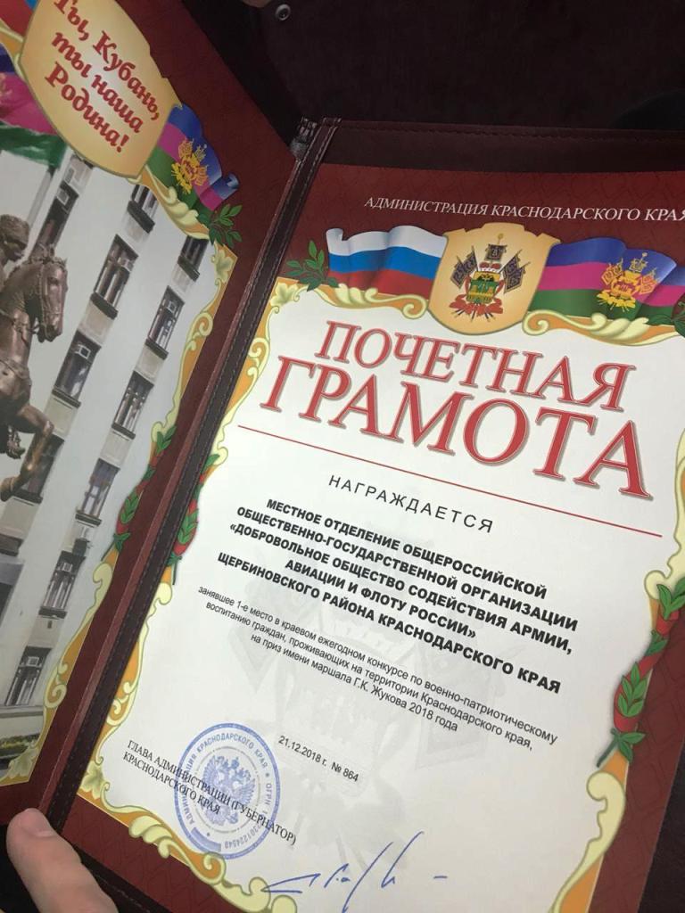 Среди лауреатов конкурса, занявших 1 место Местное отделение ДОСААФ России Щербиновского района Краснодарского края. Почетную грамоту администрации Краснодарского края председателю МО ДОСААФ Александру Даценко вручил заместитель руководителя краевого департамента по делам казачества и военным вопросам Александр Донец.