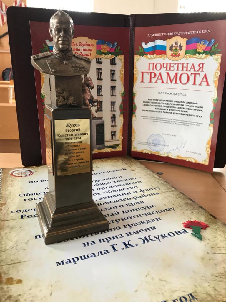 Патриотов Кубани 18 января 2019 года наградили в Горячем Ключе. Делегации всех 44 районов Краснодарского края приехали на курорт для подведения итогов краевого конкурса на приз имени маршала Жукова. Краевой конкурс по военно-патриотическому воспитанию граждан на приз им. маршала Г.К. Жукова на Кубани проводится с 1997 года и является своего рода годовым итогом всей военно-патриотической работы, проводимой в регионе. Его организаторами выступают краевые департаменты по делам казачества и военным вопросам Кубани, внутренней политики, и министерство образования, науки и молодежной политики. В этом году награды получили 56 лауреатов конкурса.